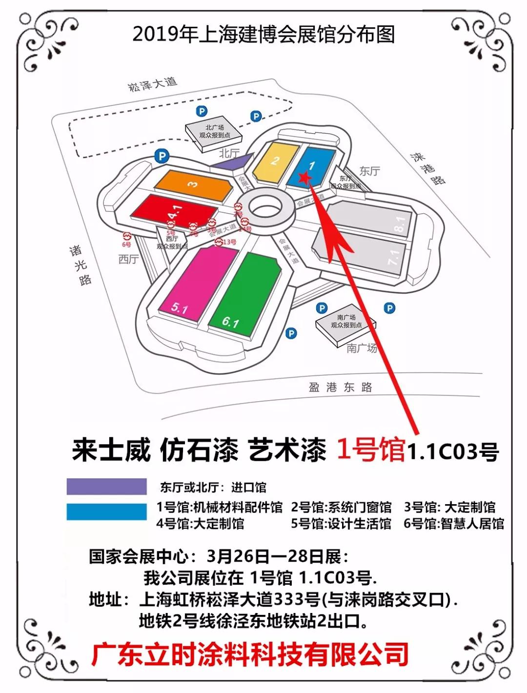 2019中國(guó)國(guó)際建筑貿(mào)易博覽會(huì)【中國(guó)建博會(huì)(上海)】將于2019年3月26-28日在上海虹橋國(guó)家會(huì)展中心舉行:來(lái)士威全新整裝涂料展1號(hào)館1.1C03,本次大展是啟用國(guó)家會(huì)展中心共7個(gè)展館,展覽規(guī)模超過(guò)17萬(wàn)平方米。廣東立時(shí)涂料科技有限公司經(jīng)過(guò)精心準(zhǔn)備,憑借著優(yōu)秀的產(chǎn)品以及精湛的技術(shù)水準(zhǔn),必將成為本次展會(huì)上的一大亮點(diǎn),敬請(qǐng)關(guān)注!