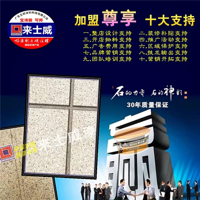 在來士威仿石漆展臺(tái),人氣高漲,前來觀摩產(chǎn)品、了解加盟政策咨詢的用戶絡(luò)繹不絕。展臺(tái)展示的系列仿石漆及藝術(shù)漆產(chǎn)品效果匠心獨(dú)具、完美詮釋了來士威仿石漆的獨(dú)特魅力!每個(gè)系列都有不同的風(fēng)采,獨(dú)特的韻味。集藝術(shù)、色彩、技術(shù)、環(huán)保與實(shí)用于一體。藝術(shù)感強(qiáng)、色彩絢麗、紋理層次多變、手感極為優(yōu)越。一經(jīng)展出,咨詢了解的人蜂擁而至。據(jù)介紹,目前來士威仿石漆推出的多項(xiàng)豐厚的加盟政策,可以幫助經(jīng)銷商輕松實(shí)現(xiàn)低風(fēng)險(xiǎn)、高收益的經(jīng)營。對于希望創(chuàng)業(yè)或?qū)で笫聵I(yè)發(fā)展突破的人士來說,來士威仿石漆是一個(gè)理想的選擇。