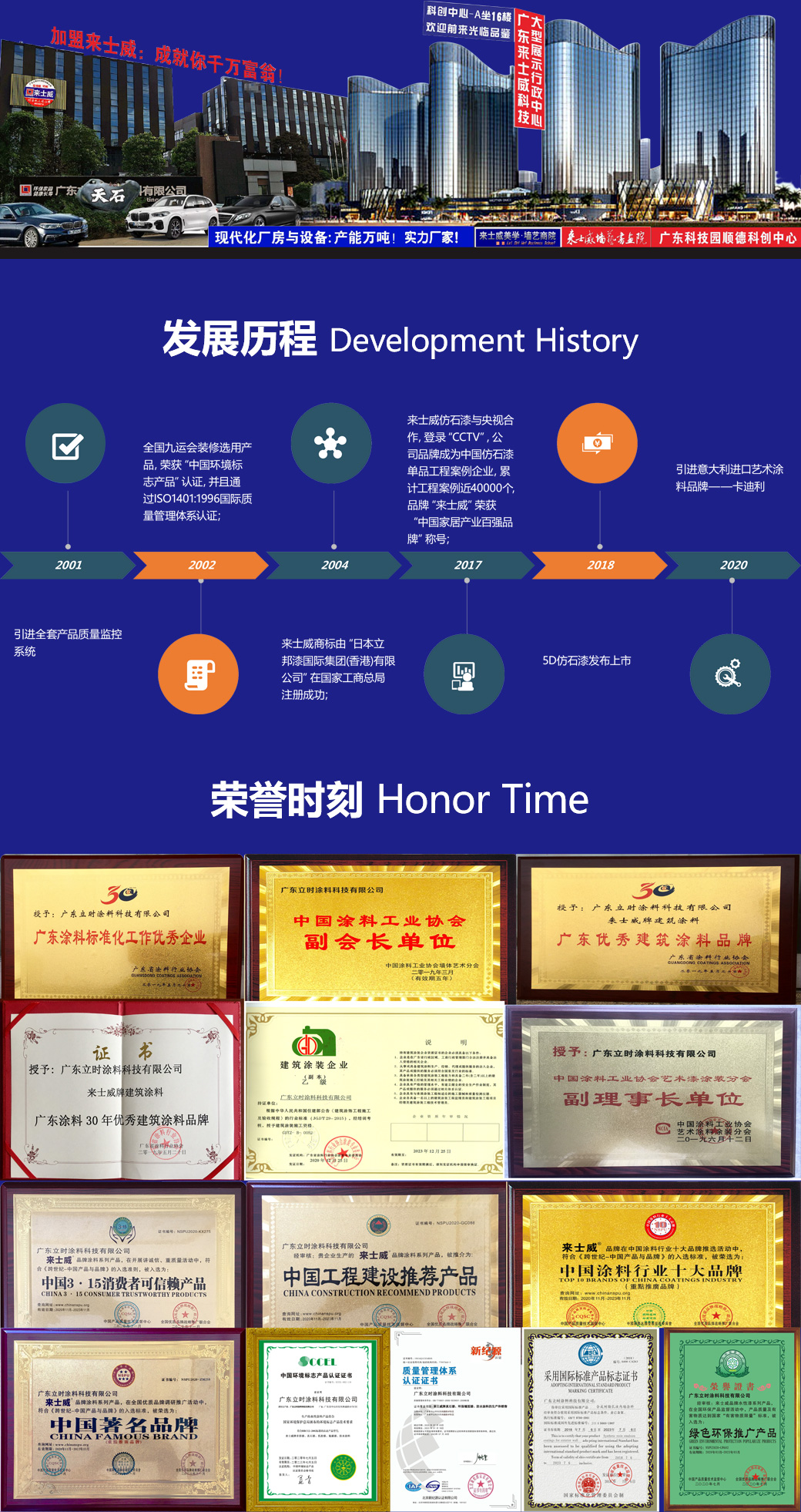 廣東立時涂料科技集研發(fā)、生產(chǎn)、銷售、服務(wù)于一體的綜合性高科技、大型專業(yè)化涂料公司;公司自成立以來,始終堅持以“質(zhì)量與技術(shù),品質(zhì)與服務(wù),品牌與創(chuàng)新”為核心理念!產(chǎn)品主要包括仿石漆大系列、工程漆大系列、藝術(shù)漆系列,墻面木器水漆系列、無機涂料隔熱漆,創(chuàng)新恒溫仿石漆系列、紅木家具專漆系列、地坪漆、金屬氟碳漆以及國防工業(yè)漆等產(chǎn)品。“立時涂料科技”經(jīng)過近二十年年的發(fā)展,產(chǎn)品遠(yuǎn)銷亞洲、非洲、歐美等國家,享有很高的美譽度和知名度。憑借其先進(jìn)的技術(shù)和管理,產(chǎn)品出口歐美、非洲、中東以及東南亞等國家,并獲得合作伙伴的高度贊譽。產(chǎn)品遠(yuǎn)銷亞洲、非洲、歐美等國家,享有很高的美譽度和知名度。憑借其先進(jìn)的技術(shù)和管理,產(chǎn)品出口歐美、非洲、中東以及東南亞等國家,并獲得合作伙伴的高度贊譽。公司為中國鐵建五局、八局十二局等、中建三局六局等、北京一建、上海三建,美的置業(yè)、保利地產(chǎn)等大型地產(chǎn)公司和建筑公司提供優(yōu)質(zhì)涂飾產(chǎn)品。